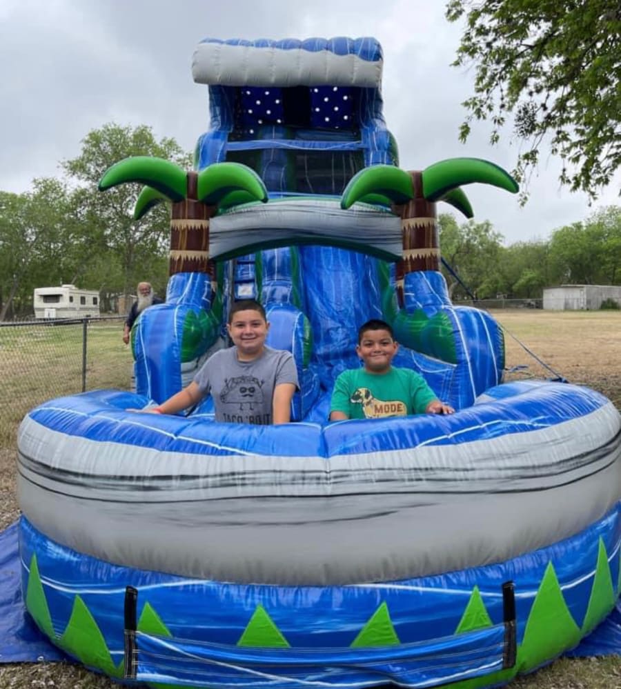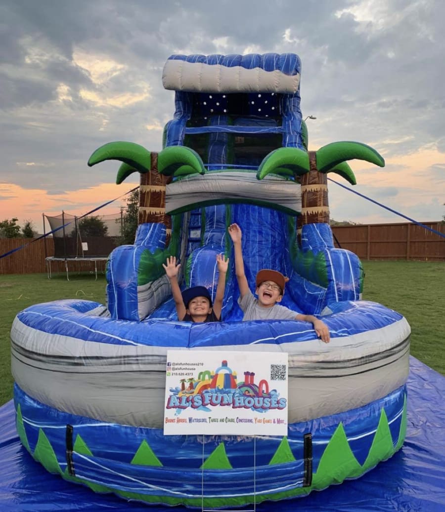 This 20-foot water slide is a block buster hit at all events and parties! This 20-foot water slide is top of the line quality commercial grade inflatable for all party occasions! Whether you want to cool off on a Saturday afternoon or dad is turning 50 and want to do something completely different than just the steak house dinner, look no further! Its eye-catching design and great color scheme, it makes the perfect gender-neutral color combination for all party themes! I personally love this slide safety features for climbing up the staircase, great handrails for 3 points of contact for climbing up the staircase! The green and blue marble look is very attractive color scheme! From Von Ormy to Converse, I have had nothing but the best feedback on my 20-foot slides!