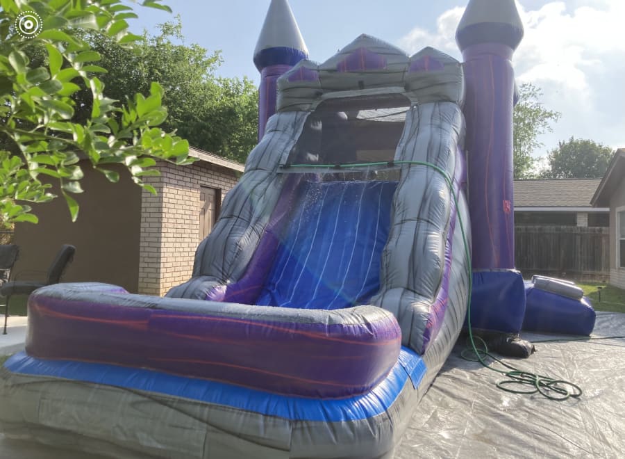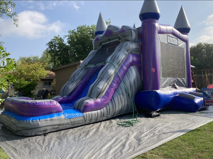 Our purple and grey combo fun house is a great unit all year round due to it can be used DRY or WET! This unit is equipped with a large bounce area, basketball hoop, and large slide! this unit is great for all ages and has many safety features such as inclined 3 step staircase for easy access climbing, large mesh windows for easy supervision and great ventilation, padded pool for a safe splash landing!